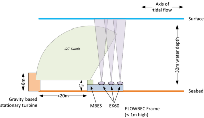 The FLOWBEC unit uses a vertical swath imagenex 837B Delta T and a vertically-mounted Simrad EK60 multi-frequency echosounder. The imagenex Imagenex active sonar is used for target tracking, classification and observations of behavioural responses of fish, diving seabirds and marine mammals. The vertical swath orientation of the Imagenex gives coverage of the full water column, but with a relatively narrow horizontal band, which will not cover the full swept area of the turbine.